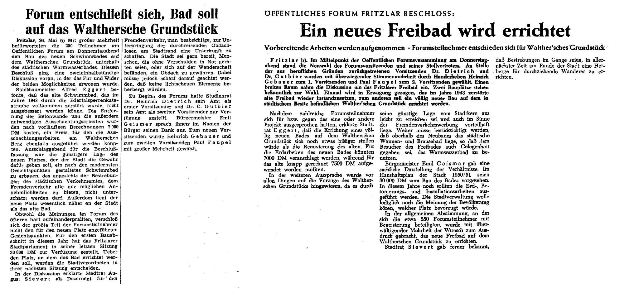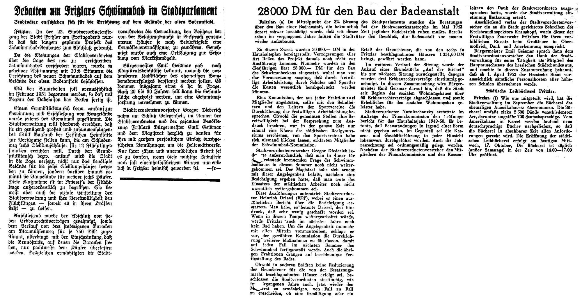 Zu den sozial relevanten Baumaßnahmen einer Gemeinde gehört seit der 2. Hälfte des 19. Jahrhunderts, nicht nur in Deutschland, auch stets die Errichtung einer Badeanstalt, zunächt aus sicher hygienischen Gründen, dann später auch mit dem Argument der Freizeitgestaltung und des sozialen Friedens. In Fritzlar findet sich bis in die ersten Jahre nach dem 2. Weltkrieg noch ein traditionelles Brause- und Wannenbad zu ersterem Zwecke. Der Badespaß wird sich früher immer in der Eder abgespielt haben, aber schon im frühen 20. Jahrhundert gibt es Berichte über eine Freibadeanstalt in der Nähe der "Blaumühle" am unteren Ende des "Hohlen Grabens". In der Zwischen-kriegszeit kam es dann zur Errichtung eines regelrechten, aber eher naturnahem Freibades am Pipprichsweg, dessen Reste heute noch zu besichtigen sind. Dieses hat aber den Bruch der Edertalsperre im Jahre 1943 nicht überlebt. So gab es bereits zum Anfang der 1950er Jahre Überlegungen auf einem benachbaretn Grundstück ein völlig neues (und ganz modernes) Schwimmbad zu errichten. Die Vorplanung (die bisweilen wohl den Charakter eines "Geplänkels" annahm) fand auch in der Öffentlichkeit (bis nach Kassel) Widerhall.  Der Ablauf sei hier protokolliert.