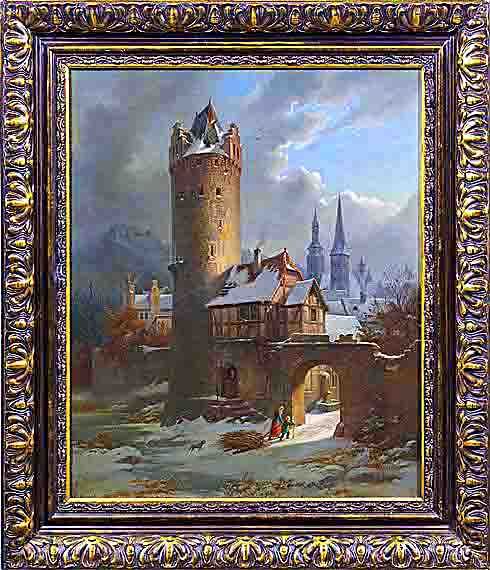 Das Motiv wirkt zunächst etwas irritierend hat aber vielleicht doch eine realen Hintergrund. Bis kurz nach dem 2. Weltkrieg trug die Straße, die wir heute "Am Hochzeitshaus" nennen den Namen "Geismarstraße", auf älteren Plänen bricht dieser Weg im Westen plötzlich rechtwinkelig nach Norden um, um heute als "Wigbertstraße" bezeichnet zu werden. Das entbehrt nicht gewisser Unlogik, denn eigentlich könnte man erwarten, daß die Führung weiter nach Westen über den "Zimmerplatz" und die heutige "Johann-Sebastian-Bach-Straße" wie einen Abschnitt der aktuellen "Kaiser-Heinrich Straße" bis zum Fuße des Eckerich verliefe, um -entweder vorbei am Kalkofen oder über den Berg- direkt nach Alt-Geismar (bis zum 13. Jahrhundert) oder Ungedanken und ederaufwärts Richtung Waldeck/Wildungen zu führen. Es ist also nicht auszuschließen, daß es tatsächlich einmal ein Geismartor in dieser oder ähnlicher Form gegeben hat, auch wenn es zur Zeit des Gemäldes nur noch in der Phantasie des Künsters (wie auch der hohe befestigte Berg im Hintergrund: "Hellen", "Hoher Berg" oder gar "Büraberg", und die eigenartige Positionierung der Stiftkirche St. Peter wie der Kurie in der Fischgasse) existierte. Das "Schilderertor" markierte ursprünglich den Weg nach Züschen und das damals noch mainzische Naumburg. die Haddamargasse (heute Kasseler Straße) und das "Haddamartor" öffneten sich über den gleichnamigen Ort Richtung Wolfhagen und Paderborn zum sog. "Hellweg" im Norden, das "Werkeltor" nach ebendiesem Ort und Kassel (Cassel), während das "Münstertor" in Richtung Osten, evtl. nach Leipzig oder darüber hinaus auch nach Südosten zeigte. Zugleich wies es aber Richtung Frankfurt (und letztendlich Rom). Das "Wintertor" im Südwesten der Stadt schließlich gab den älteren Weg (vom Bau der steinernen Ederbrücke) über Holzheim nach Süden und über Biedenkopf. Koblenz, Paris und Santiago de Compostella frei, wie Hinweise auf den Hl. Jakob belegen. Fritzlar bildete also eine "Spinne im Netz", was lange Zeit in wirtschaftlicher und (bis in das 16. Jahrhundert) auch in politischer Hinsicht seine Bedeutung und seine relative Wohlhabenheit erklärt.