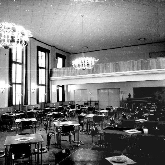 Blick in den Saal mit Tribüne Richtung Eingangshalle