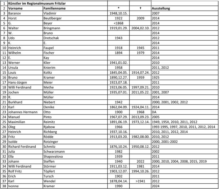 In den Jahren 1949 bis 2014 veranstalteten zunächst der Verkehrs- und Verschönerungsverein Fritzlar und ab 1956 der Museumsverein und seine Mitglieder immer wieder Ausstellungen heimischer wie auswärtiger Künstler. Es ist das Anlie-gen dieser Seite an die breite Palette und ihre Schöpfer zu erinnern, indem wir versuchen wenigstens ein Teil der Werke zu präsentieren. Zu den einzelnen Veranstaltungsdaten und die Anlässe s. die Seite regionalmuseum-fritzlar-virtuell.com/ Museumsgeschichte; die Liste wird noch weiter ergänzt werden. In diesem Zusammenhang danke ich meinem ehemaligen Mitglied des Vereinsvorstandes Klaus Leise für wertvolle Tipps und Hinweise.
