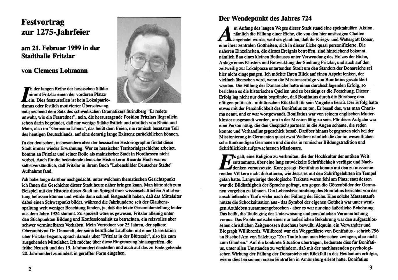 Der hier wiedergegebene Festvortrag des damaligen Stadtarchivars Clemens Lohmann M.A. anläßlich der 1275-Jahrfeier der Stadt Fritzlar, der hier in der Ausgabe der Hessisch-Niedersächsischen Allgemeinen (HNA) wiedergegeben ist, zeigt den Forschungsstand der geschriebenen Geschichte am Ende des 20. Jahrhunderts. Er belegt die fachliche Kompetenz des Autors und zeichnet sich auch dadurch aus, daß dieser -bei den üblichen erinnerungswertigen Epochen- auch eine ge-wisse Schwerpunktverlagerung auf  die jüngeren Phasen der Stadtgeschichte und das  erkennen läßt, was man heute "Zeitgeschichte" nennt. Dabei vergisst er nicht auch die jüngsten Entwicklungen und ihre politische Akteure zu erin-nern, ohne ausdrücklich ihre Namen zu nennen.