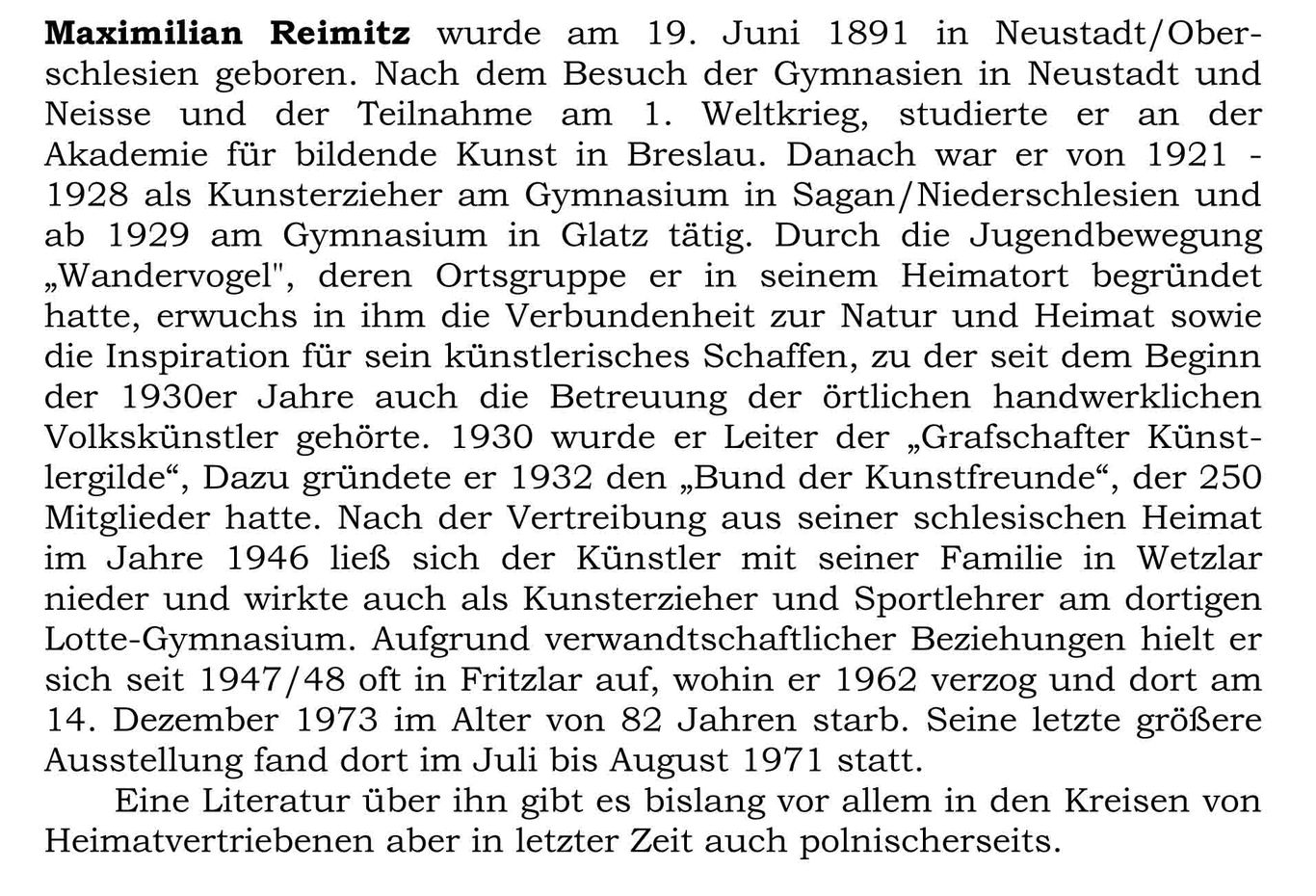 Schon zwischen den Kriegen umfasste das zeichnerische und malerische Oevre von Maximilian Reimitz aus Landschafts-, Genre- und Portraitbildern eine sehr breite Themenpalette, zu der dann noch Gestaltungen in Holz, Scherenschnitte und andere bildnerische Tätigkeiten zählten. Er betreute seit dem Beginn der 1930er Jahre zusätzlich Heimarbeiterfamilien im Glatzer Bergland und besserte sein schmales Lehrergehalt damit auf, daß er auch Bilder auf Bestellung fertigte. Nach der Vertreibung montierte er regelrechte Kataloge, aus denen sich vertriebene Familien zum Trost und zur Erinnerung Motive ihrer alten nun aber auch neuen Heimat heraussuchen und bestellen konnten (ein besonders schönes Beispiel bilder das Katalog-Bild Nr. 27: Lauterbach, wo Vorlage und Ausführung direkt zu beobachten sind). Es kam dabei natürlich zu immer wieder ähnlichen Bildern, bei denen es sich aber nie um Drucke sondern immer tatsächlich per Hand gefertigte, gezeichnete, aquarellierte oder in Öl und Tempera gemalte Werke handelte!