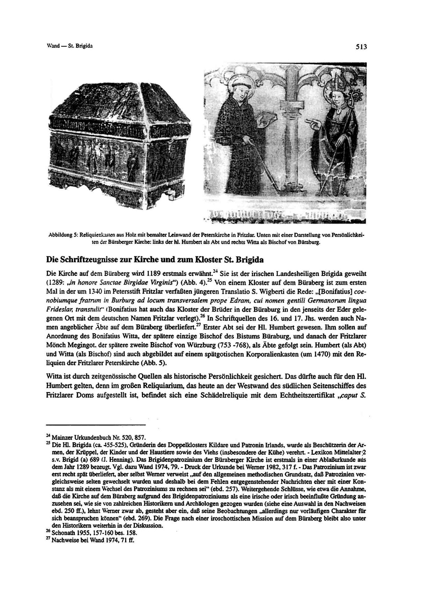 Im Sommer 1995 und im April 1996 gingen ehemalige Mitarbeiter der Ausgrabung Büraburg (1967-1973) noch einmal eini-gen Spuren der Bebauung auf dem Gipfelplateau nach, auf die uns der damalige Ungedänker Totengräber Bubenhagen aufmerksam gemacht hatte, weil sie ihm zuvor bei der Anlage einer Grabgrube für die verstorbene Gattin des langjäh-rigen Dorfschullehrers, Herta Schollmeyer, aufgefallen waren. Es handelte sich um eine sorgfältig gemauerte Gebäude-ecke, die recht genau in der Flucht der Westfront der Brigidenkapelle gefunden wurde. Der im Rahmen dieser Untersu-chung gezogene Suchschnitt mit Hilfe des langjährigen Mitausgräbers und Baggerführers Hermann Schröder aus Lich erbrachte daraufhin mehrere schmale Mauerfluchten in ungefährer Nord-Süd-Ausrichtung, die sich mit den bisher be-kannten Befunden östlich und nordostwärts der Kapelle durchaus in eine sinnvolle Verbindung bringen ließen. Als sich dann auch noch, ungefähr in der Mitte des umschlossenen Areals eine grubenförmige Vertiefung aufgedeckt werden konnte, verfestigte sich die Vermutung, daß man es nördlich der Brigidenkapelle mit einer Art claustrum ("Klausur") mit einem zentralen Becken zu tun haben könnte. Damit hätte sich der Rang und die Bedeutung dieser Kirchenanlage erheb-lich erhöht, was gut zu dem überlieferten Narrativ der Örtlichkeit passen konnte.