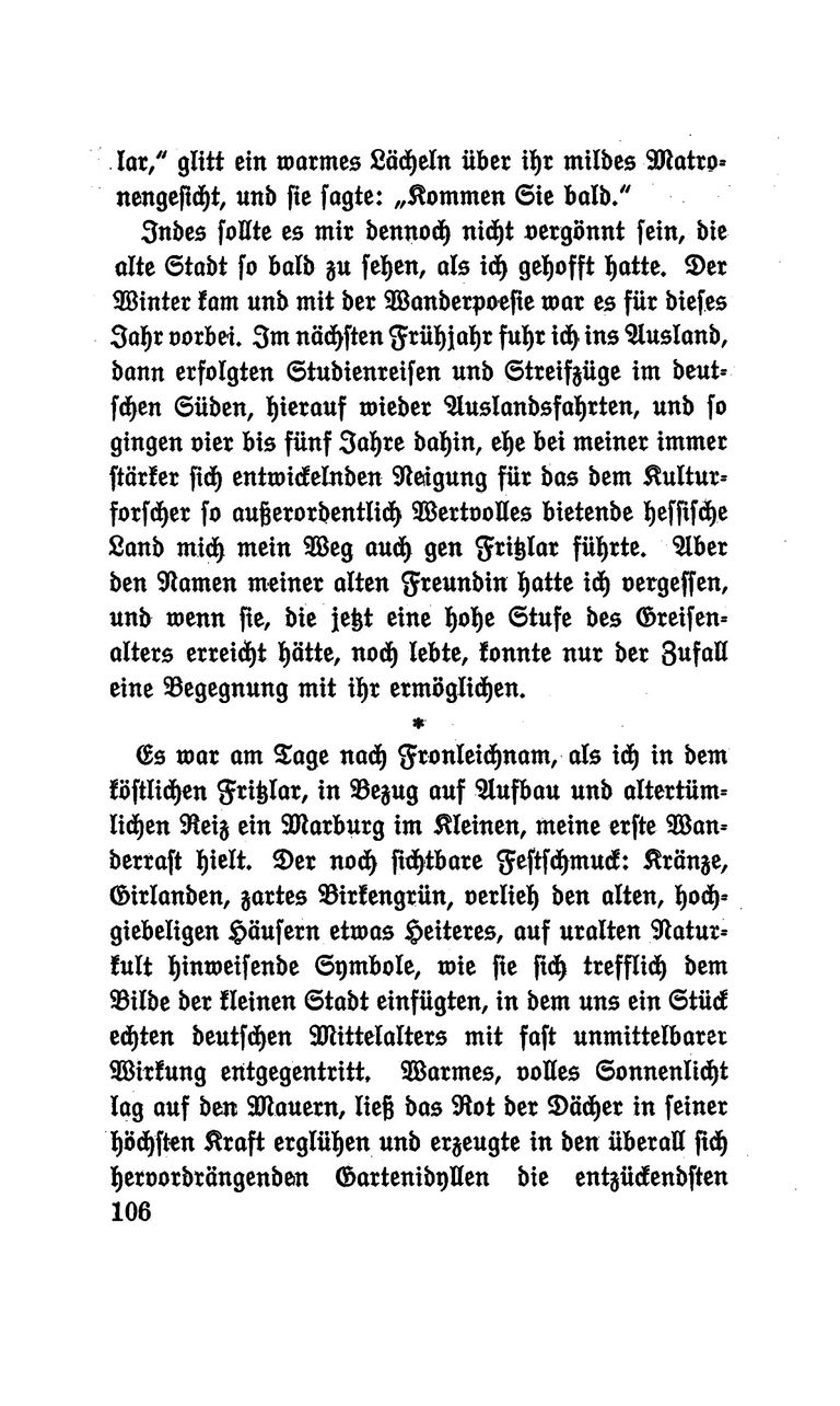 Damit wären wir bei der Frage: In welche Epoche haben wir die geschilderten Erlebnisse einzuordnen? in unserem Falle: Welche Gegenwart Fritzlars beschreibt er und wann? Mit dem Veröffentlichungsdatum 1921 liegt immerhin ein terminus ante vor. Da der gerade vergangene Weltkrieg mit keinem Worte erwähnt wird, müssen wir davon ausgehen, daß er seine Fahrt und/oder Wanderung durch Nordhessen vor diesem Ereignis erlebt hat. Eine gwisse Hoffnung auf eine zeitliche Eingrenzung ergibt sich aus seiner Erwähnung des kunstgeschichtlichen Führers von Christian Rauch (S. 108). Da liegt aber ein Problem: dieser soll (nach wikipedia) erst 1927 erschienen sein! Da Rauch in Hessen erstmals mit seiner Gießener Habilitation 1906 auftaucht und 1912 einer der Mitbegründer des "Oberhessischen Kunstvereins" wird, ist es möglich, daß es eine ältere Fassung dieses Führers für Fritzlar gab. Tatsächlich erwähnt Rauch (1877-1976) in seiner Ein-leitung von 1927 eine erste Auflage im Jahre 1905, die er als "Nebenfrucht" seiner "Bearbeitung des Denkmälerinventars vom Kreise Fritzlar" bezeichnet.  Diese erschien nach seiner Arbeitsaufnahme in Gießen jedoch zunächst unter einem anderen Verfassernamen. Dennoch erwähnt Rehm ausdrücklich Rauch als Urheber, d. h. wann wurde der Text auch offizell diesem zugeordnet, bekannt und offenbar verbreitet?  Setzen wir das Frankfurter Treffen mit der reifen Dame um die Jahrhundertwende an, wird man den ersten Besuch zwischen 1906 und 1910 und den zweiten noch vor 1914 vermuten dürfen. Wann dann der Text eigentlich niedergeschrieben wurde, ist nur zu vermuten (eher nahe 1914).