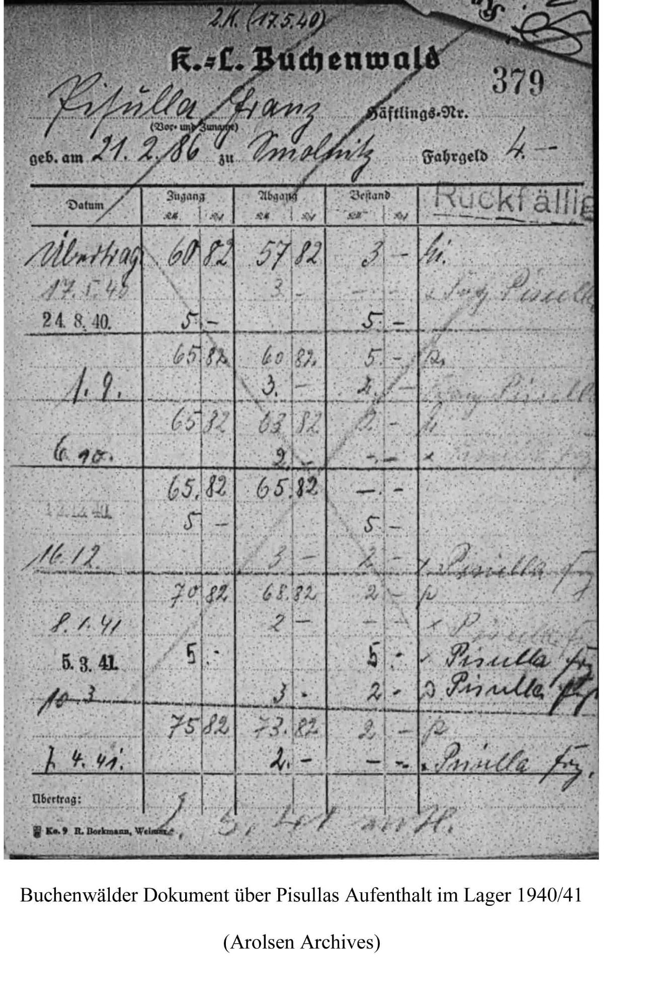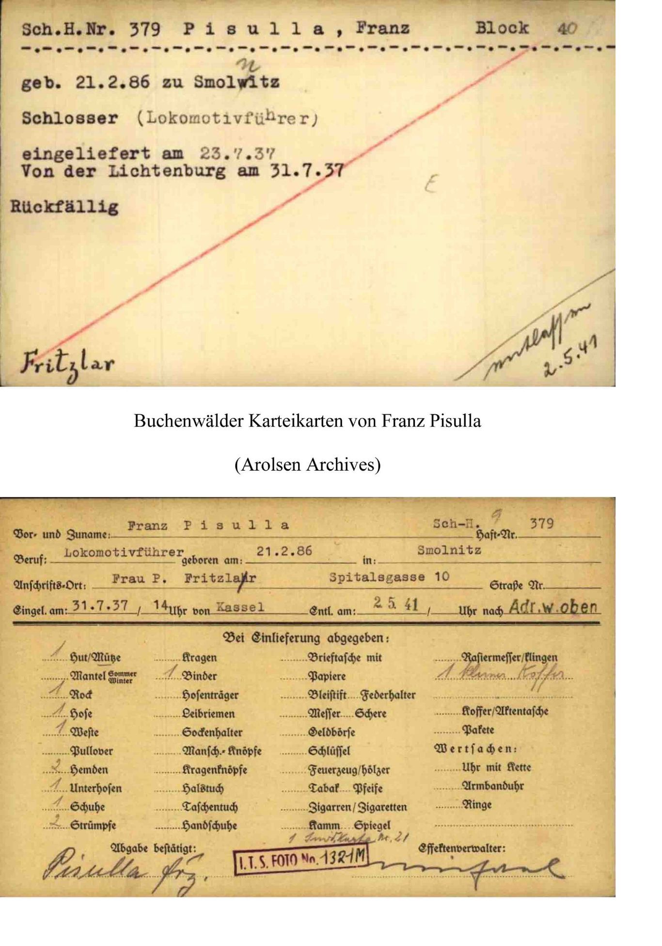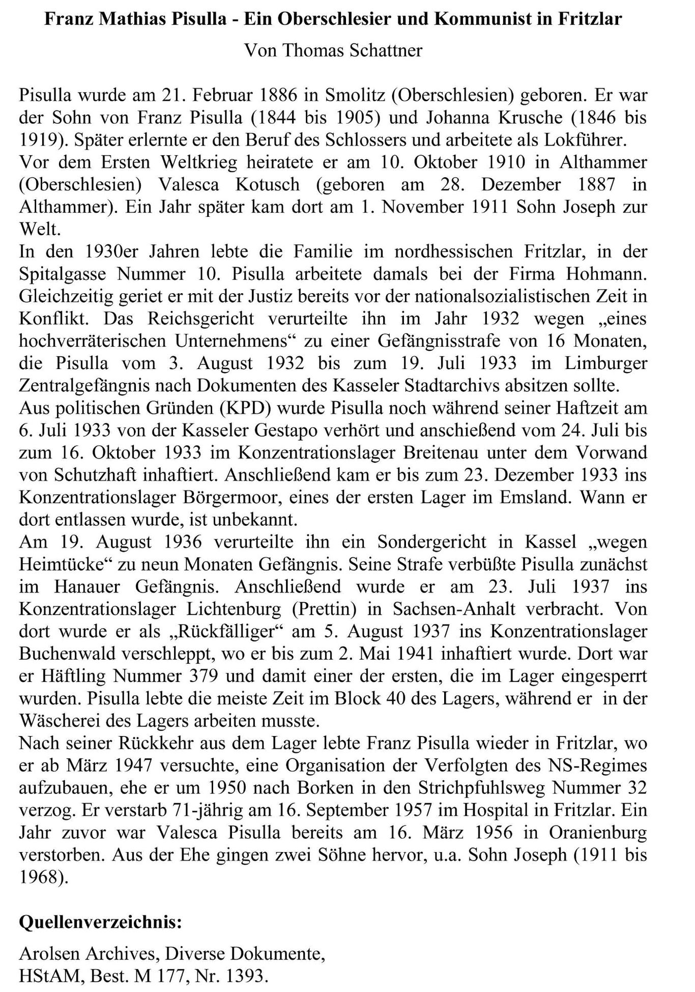 Zu den Merkwürdigkeiten bei der nationalsozialistischen Verfolgung politischer Gegener gehörte wohl die Tatsache, daß man mit ihnen zwar ebenfalls sehr rücksichtslos umging aber andererseits differenzierte. Trotz seiner wiederholt politischen Auffälligkeit fand der Fritzlarer Einwohner Pisulla mit seiner Familie  seinen Lebensunterhalt, war aber auch permanent durch Verhöre, Schutzhaft oder gar KL-Haft bedroht bzw. ihnen ausgesetzt. Ob er all diese Gefahren überlebte, weil er sich sehr anpassungsfähig war (s. Notiz vom Juli 1933)  oder einfach nur Glück hatte, wird sich heute nicht mehr klären lassen, sein Schicksal war schwer genug.
