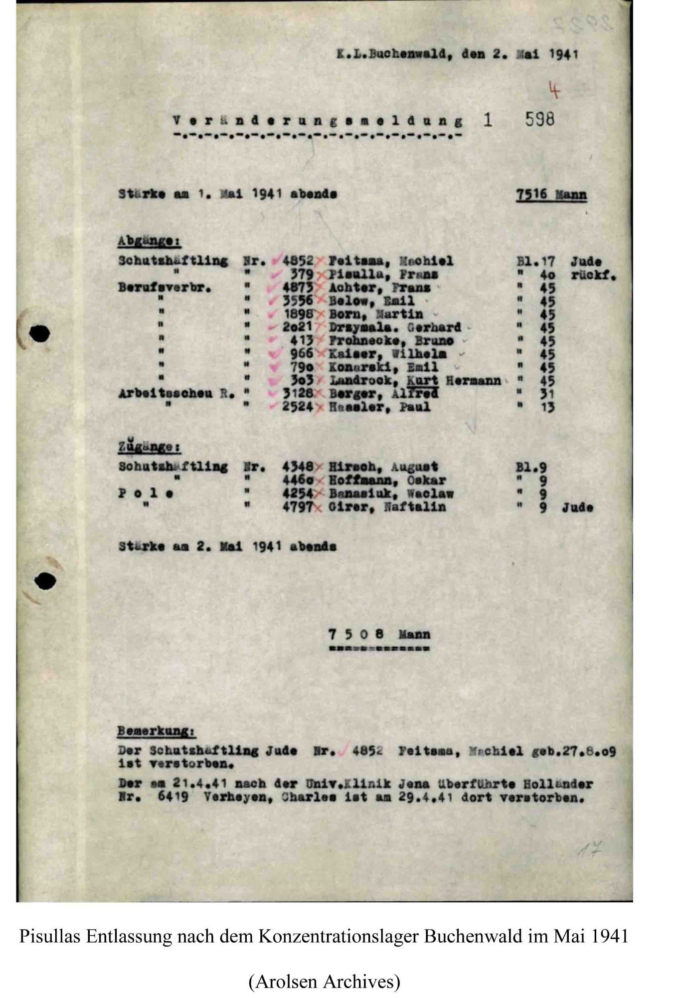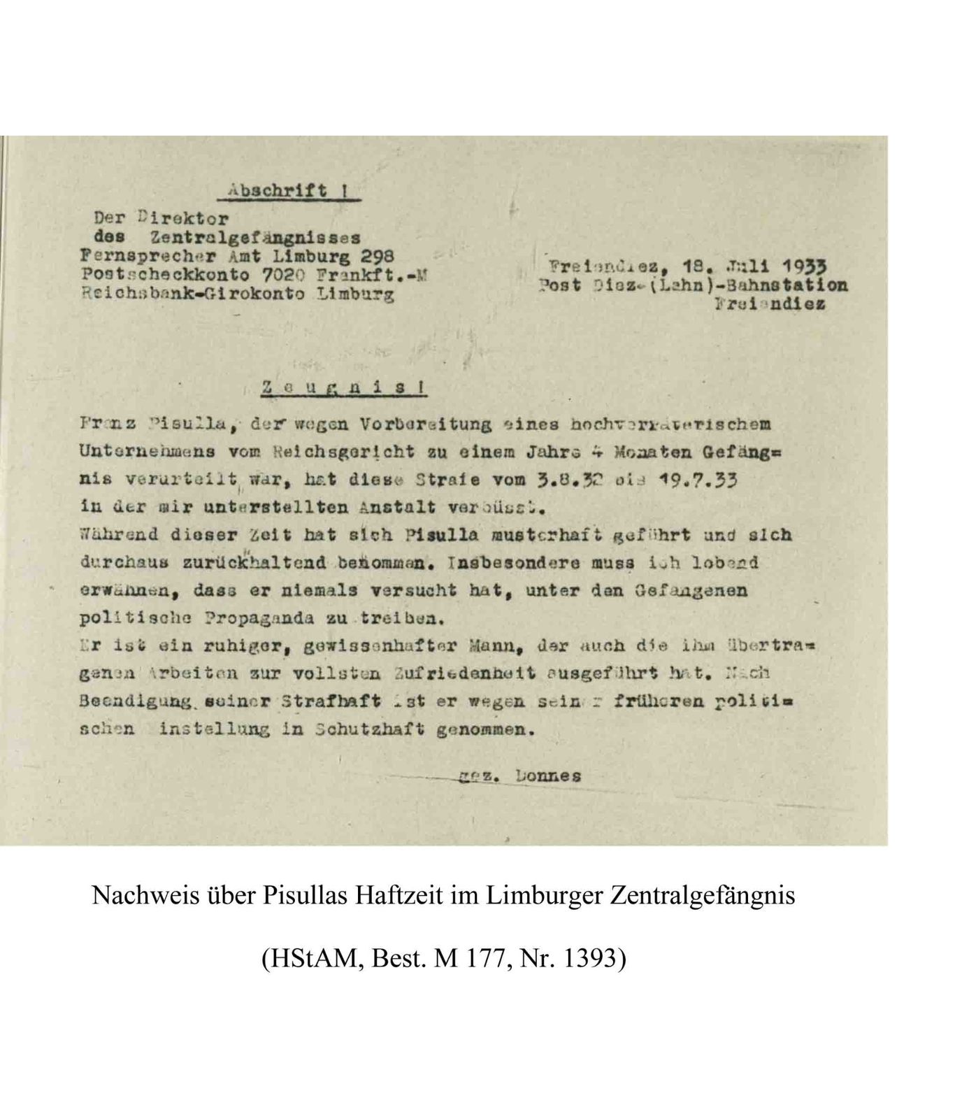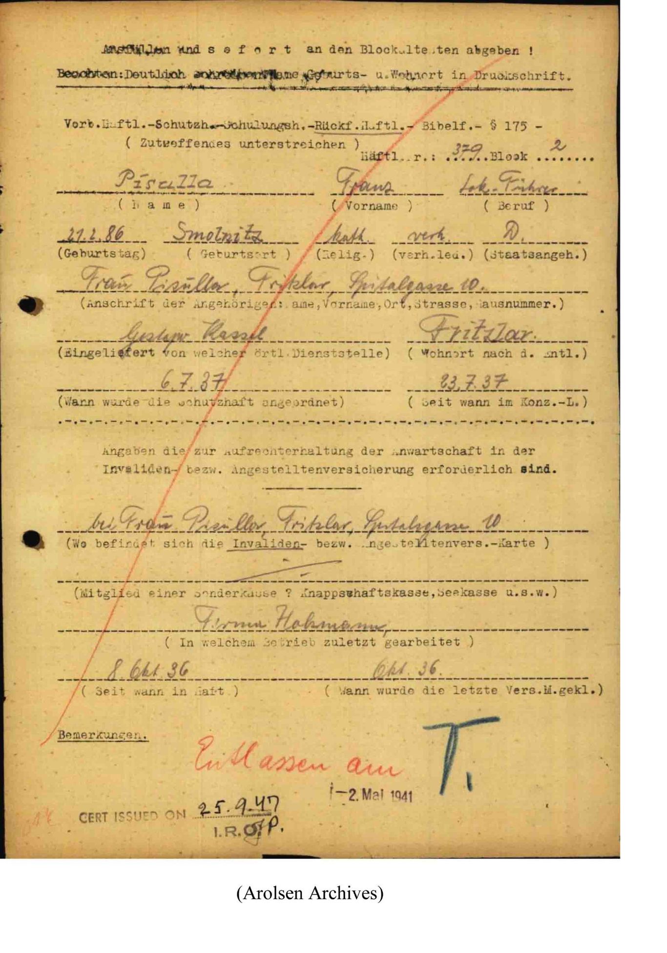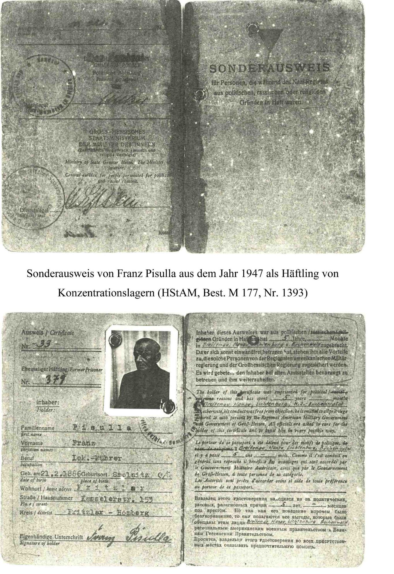 Zu den Merkwürdigkeiten bei der nationalsozialistischen Verfolgung politischer Gegener gehörte wohl die Tatsache, daß man mit ihnen zwar ebenfalls sehr rücksichtslos umging aber andererseits differenzierte. Trotz seiner wiederholt politischen Auffälligkeit fand der Fritzlarer Einwohner Pisulla mit seiner Familie  seinen Lebensunterhalt, war aber auch permanent durch Verhöre, Schutzhaft oder gar KL-Haft bedroht bzw. ihnen ausgesetzt. Ob er all diese Gefahren überlebte, weil er sich sehr anpassungsfähig war (s. Notiz vom Juli 1933)  oder einfach nur Glück hatte, wird sich heute nicht mehr klären lassen, sein Schicksal war schwer genug.