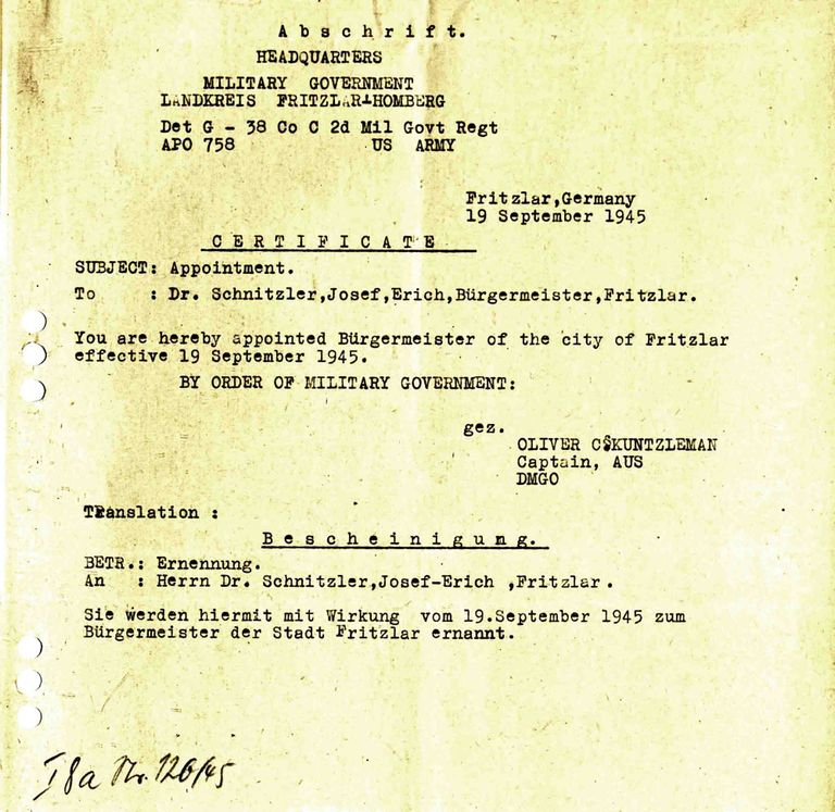 Dr. Erich Schnitzler war gegenüber Heckmann ein erfahrener Verwaltungsfachmann mit viel Berufserfahrung, der aus einfachen Verhältnissen stammte. Sein Vater Hermann, Jahrgang 1875, war von Beruf Maschinensteller, seit dem Jahr 1897 war er mit Christine May (Jahrgang 1873) verheiratet. Zunächst war Schnitzler Oberrealschüler ehe er im Jahr 1917 Volontär in der Verwaltung seiner Heimatstadt wurde. Von Januar bis November 1918 war er Kriegsfreiwilliger bei der ersten Seefliegerabteilung in Kiel, um danach zurück in die Verwaltung von Solingen-Wald zurückzukehren. Von 1920 bis 1924 studierte Schnitzler in Düsseldorf und Hamburg Rechts- und Staatswissenschaften. Anschließend war er erneut von 1924 bis 1931 in der Stadtverwaltung von Solingen angestellt, bevor er im Jahr 1931 als Rathauschef nach Fritzlar wechselte. Dort wurde er für zwölf Jahre von der „Zentrumsmehrheit“ ins Amt gewählt. Unter seiner Verantwortung wurde in seiner kurzen Amtszeit die neue Ederbrücke gebaut, durch die Neupflasterung zahlreicher Straßen verbesserte er das Stadtbild und auch die Finanzen der Stadt brachte Schnitzler in Ordnung.