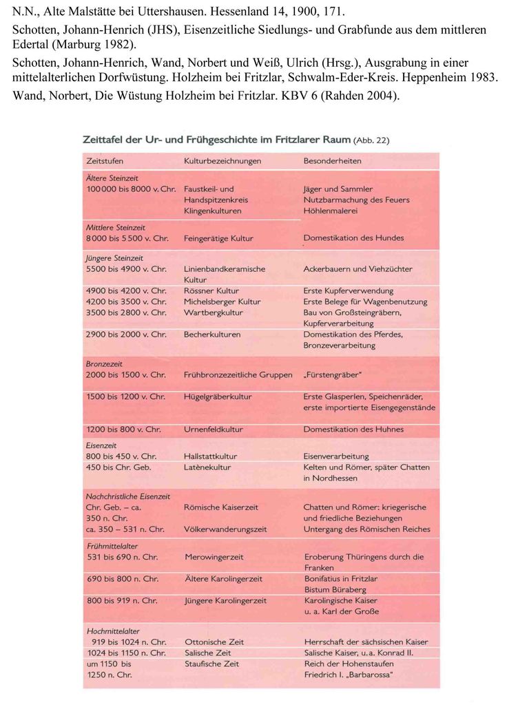 Anlässlich der 40jährigen Zugehörigkeit des Dorfes Uttershausen zu Wabern, das aber auf eine über 900jährige Ersterwähnung zurückblicken kann, baten Mitglieder des Kulturkreises Uttershausen e. V. die Drr. Jürgen Kneipp und Johann-Henrich Schotten um einen Beitrag zur Vorgeschichte in einem Festband. Erstere hatte zuvor schon mehrfach baubegleitende Ausgrabungen durchgeführt, während das Regionalmuseum Fritzlar Dank der langfristigen Tätigkeiten seiner Arbeitsgemeinschaft über einige dokumentierte Funde verfügte. Es entstand ein Aufsatz (S. 19-41), bei dem es auch gelang, den Ursprung, die Entwicklung und die mittelalterliche Struktur des Dorfes einzuordnen.