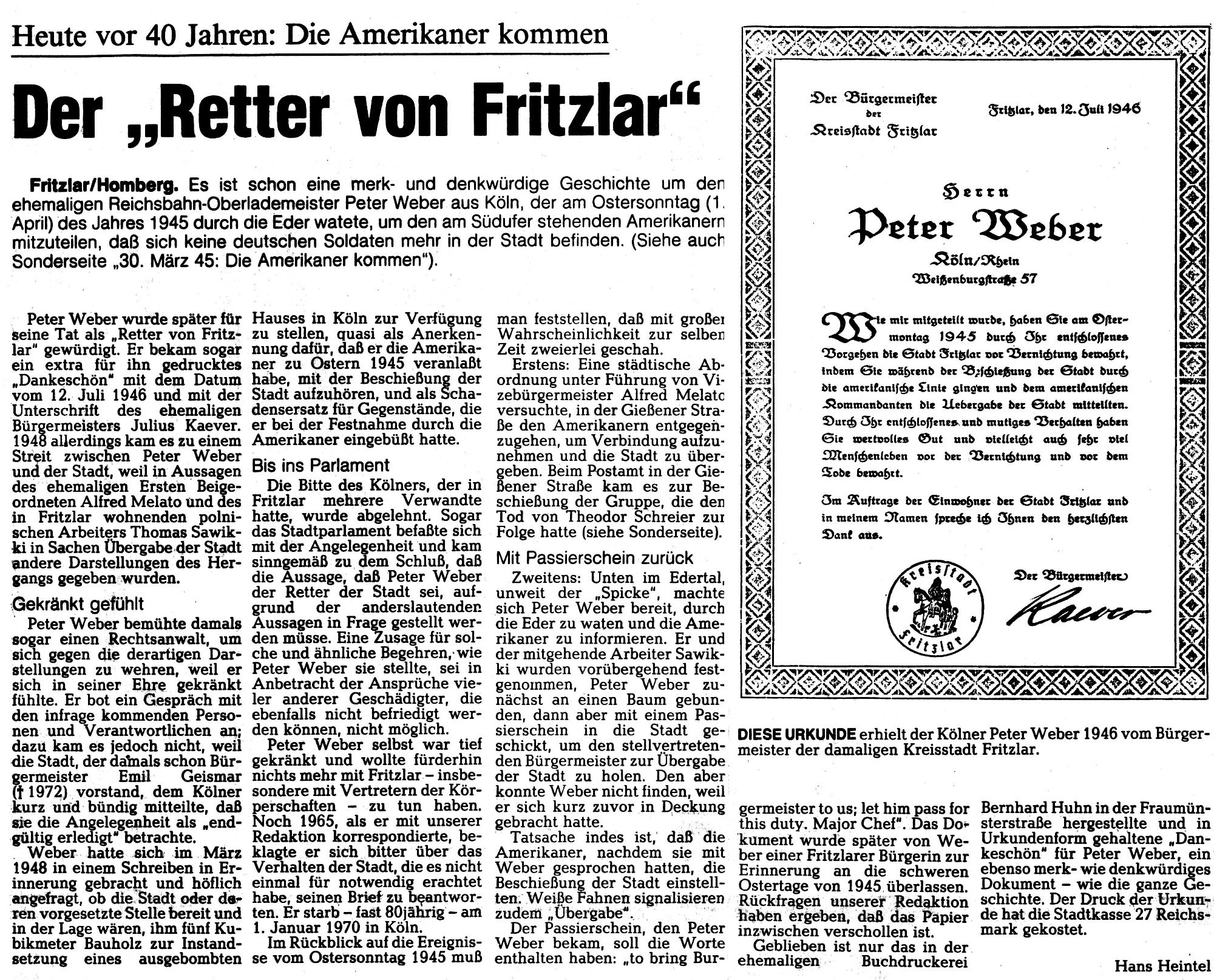 Die Vorgänge während der Ostertage 1945, als die Stadt Fritzlar von den US-amerikanischen Truppen eingenommen und besetzt (und/oder befreit) wurde, sind den interessierten Einwohnern der Stadt schon länger bekannt. Das liegt u. a. auch an dem Bericht des aus Köln stammenden Eisenbahnbeamten Peter Weber, der in Fritzlar stationiert war aber auch familiäre Beziehungen hierher hatte. Er fasste seine Beteiligung an den Ereignissen später in einem Schreibnaschinenmanuskript zusammen, von dem es anscheinend mehrere Durchschläge und Kopien in unterschiedlichem Erhaltungszustand gibt. Ein Exemplar wurde kürzlich, d. h. Ende April/Anfang Mai 2025 auf der facebook-Seite "Fritzlar meine Heimatstadt" photographisch veröffentlicht. Da eine digitale Bildschirmphotographie in der Regel mit nur 72 dpi erfolgt, war es zwar möglich die Bilder zu dokumentieren und zu entzerren, ein einfaches OCR-Programm ergab aber keine praktische Lesbarkeit, sodaß die vergrößerten Scans abgeschrieben werden mussten. Dabei schlichen sich gelegentlich Undeutlichkeiten ein, für die ich um Verständnis bitte. Orthographische Details habe ich überwiegend unkorrigiert stehen lassen, Absätze nach Eigenart des Programms gestaltet, weil es mir darum ging, die historischen Abläufe zu dokumentieren und denoch die Authentizität des Textes zu wahren.